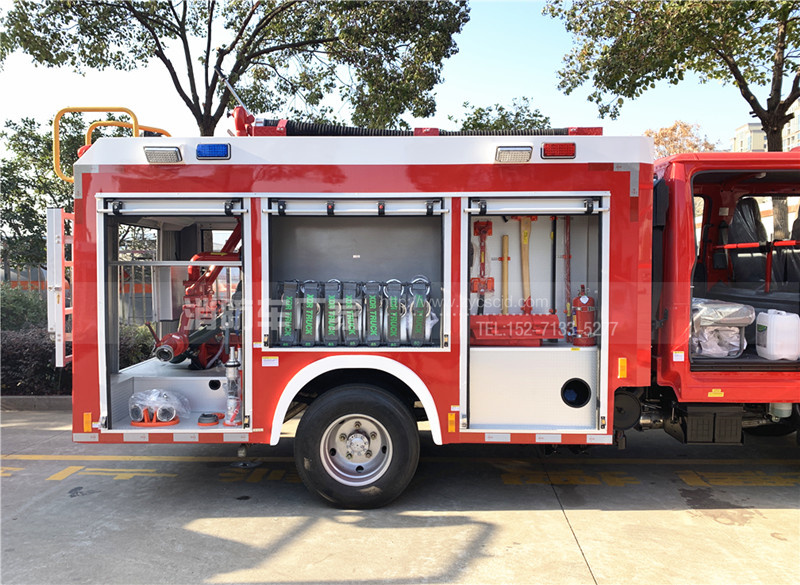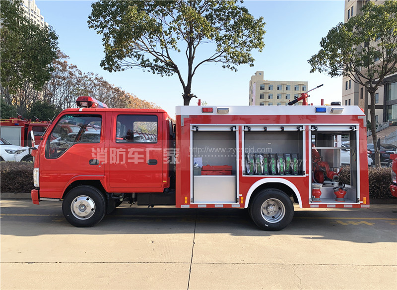 五十鈴3噸水罐消防車,五十鈴120馬力發動機,底盤型號:QL1070BUKWY,發動機型號:4HK1CN6LB,7.00R16輪胎,紅色雙排駕駛室,軸距:3815mm。罐體容積:3噸水,配備上海茸申CB10/20消防泵,成都威斯特PS20消防炮,紅色警燈,整車消防紅。水射程:≥50m。